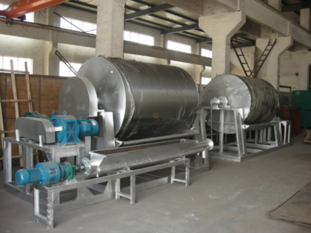 滾動刮板干燥機由主滾筒、機架、加料裝置(上部加料或下部浸料)、驅動機構、螺旋送料裝置、吸塵裝置、刮刀裝置等部件組成。